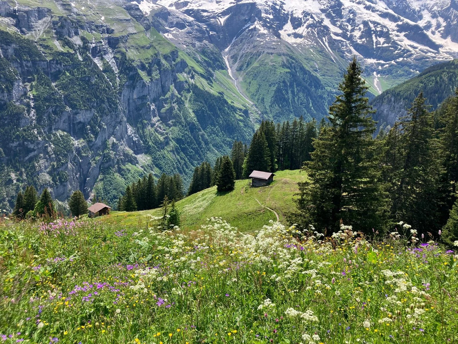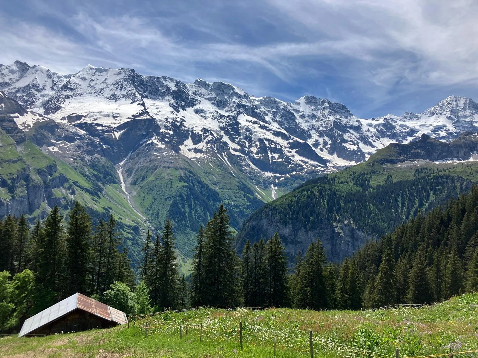 Your journey begins with a serene, shaded stroll through the Marcheggwald from Grütschalp. As the landscape opens up, you'll encounter quintessential alpine scenery near Sousläger, characterized by expansive meadows, rustic mountain huts, grazing cows, and a meandering mountain stream.